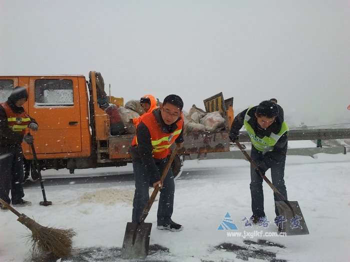 由于元旦三天休假,玉山管理处除保证高速公路正常运营外,该处还安排了部分员工值班。该处领导从1月3日傍晚6时起,组织留守值班员工不断在玉山段沿线撒工业用盐,以加快冰雪的隔化速度。针对天气气温急剧下降,降雪趋势明显,1月3日晚上,玉山管理处组织值班、养护、保养等部门员工召开紧急会议,部署除冰雪保畅通工作。 会议明确,当前的主要任务是除冰雪保畅通,给过往车辆通畅的行车路况。该处除当班收费员外,其余员工进行排班上路除雪除冰;及时补充消耗的应急物资。目前玉山养护所储备安全锥500个,麻袋4000个,工业用盐30吨,防滑链条10副,铁铲60把,备足了扫把手电筒等应急物资。