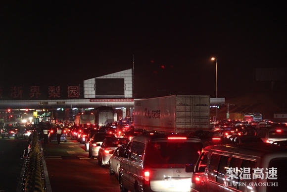 今年春节后,梨温高速一天的出口车辆突破了6万辆,车流量较比去年同期增长了20%。在赣浙省界处,梨温高速上最大的梨园收费站,收费广场内汽车发动机的轰鸣声响成一片,从早上8点到凌晨4点一直在人的耳膜外鼓动,工作人员则要用对讲机大声喊话,才能传达信息。伴随着车道高分贝的轰鸣,收费站区如一个生产中的巨大车间。