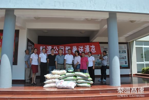 8月3日,梨温公司党委副书记、纪委书记雷霆、工会负责人等一行组成慰问组,顶着高温炎热,将公司工会精心采购的2000余斤绿豆、1000余斤冰糖、200余斤白莲及正气水、风油精等防暑降温品送到了梨温高速沿线处站。