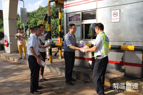 7月29日,省高速集团副总经理段卫党、工会副主席谢泓率相关工作人员赴梨温高速公路进贤收费站,给奋战在一线的员工送去绿豆、冰糖、菊花茶等防暑用品。总公司党委副书记、纪委书记刘楚有,梨温公司总经理潘皓、党委书记周洪达,总公司工会副主席邓丽一同前往。