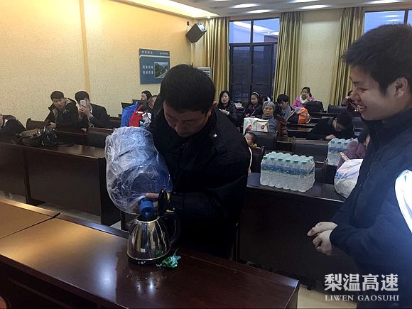 沪昆高速经开区站工作人员看到这一幕,立即赶至站门口,安置30余名乘客在一楼大会议室等候,将空调暖气打开后,还提来几桶桶装饮用水,并用烧水壶烧开水,让乘客们喝上一口口热水。
