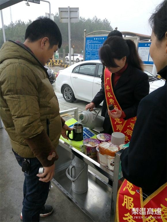1月19日,梨温高速广丰高速收费站工作人员在热情地为过往司乘人员提供热开水、餐巾纸、应急药品等服务。