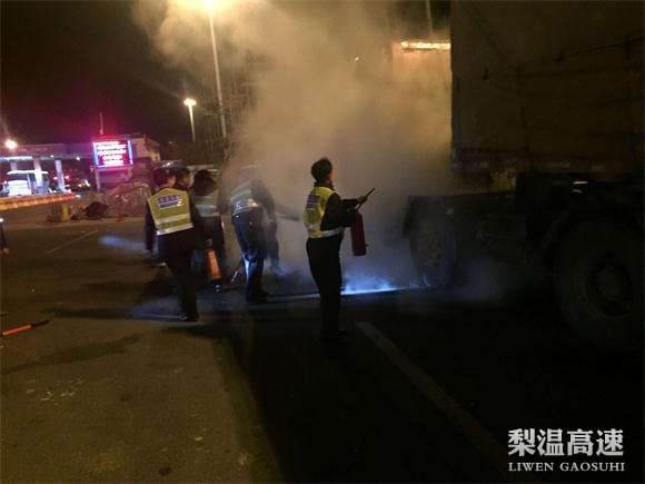 据了解,2月15日晚8点20分,一辆车牌为浙J692**装载塑料的货车驶入赣浙界梨园收费站20道时,左前轮胎浓烟滚滚并冒着大火,驾驶员被突如起来的大火吓得惊慌失措。此时正在疏导车辆的班长秦连军第一时间赶到现场,一边组织人员灭火,一边引导车辆远离着火车辆。着火车辆被扑灭后驶出岗亭时,再次出现浓烟,班长秦连军又组织人员进行二次救援。