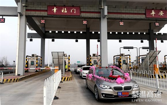 春运首日,南昌南管理中心南昌南收费站的“幸福门”里迎来了一组迎亲车队。从南昌南站七个门中的“幸福门”经过,寓意为“幸福、美满”。