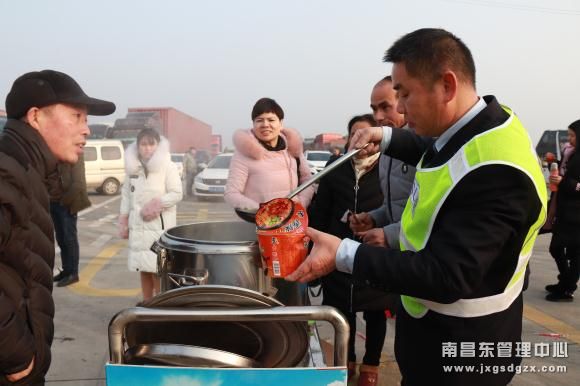 1月22日,南昌南管理中心杜市收费所组织员工开展大雾天气送温暖活动,为滞留的旅客送去冬日里的温暖。