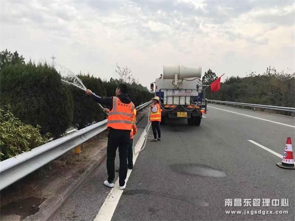 该中心东乡养护所每天投入10余台洒水车、15台安保车辆、10台抽水机上路,采取人工牵管浇灌和洒水车喷灌相结合的方式,不间断的对中分带受旱较严重的苗木优先、多次浇灌,确保苗木成活和浇灌效果。