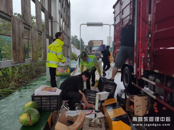 下午13:00左右一辆赣EK的绿通车货物突然倒塌在车道,站长一边指挥分流,另一边安排人员帮忙,自己也健步如飞上前搬运货物,司机师傅看到大家帮忙不好意思地说:你们这么忙,淋着雨在指挥车辆,身上都湿了我还跟着添乱,太对不起你们了,太谢谢你们了。