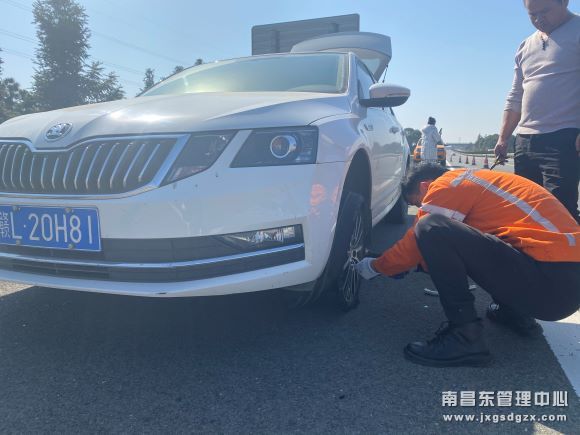 罗湖养护站驾驶员张新春见状立即将车停在该小车后方,并在来车方向150米处放置警示标志后上前询问情况。原来该车主驾驶车辆准备回老家鹰潭,不料行驶至此,车辆突然爆胎,需要更换备胎,由于他自己不会更换轮胎,正心急如焚。了解情况后,张新春立即从车上取出工具箱,帮助车主更换备用轮胎。
