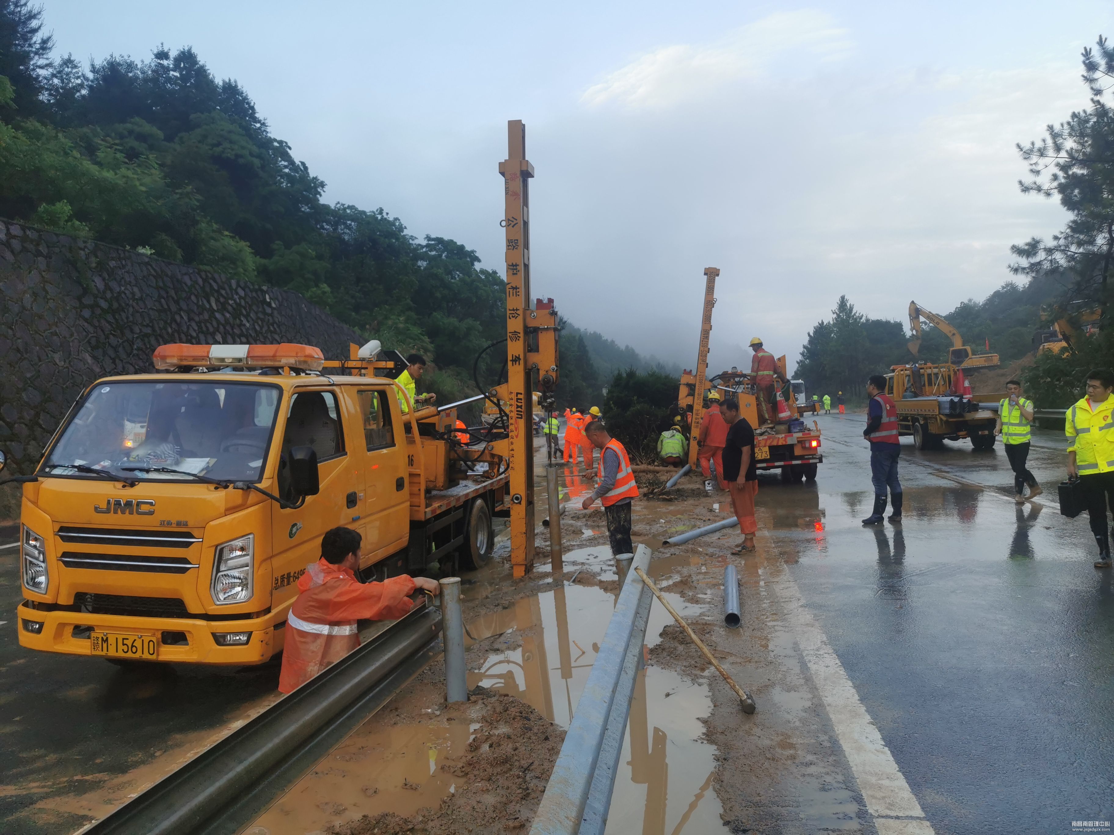 21日上午9点左右,路面终于被清理干净,抢险队员们才终于有时间坐下来休息。而作为交安设施维修队其中一员,他们还要负责将中央隔离带和道路边上的护栏立柱、护栏板进行安装。由于打开的中央隔离带(便于近端分流车辆)距离塌方点还有一段距离,当时接到抢险任务比较急,出门啥也没带,手机也没有电了,所以他只能走路当面通知。
