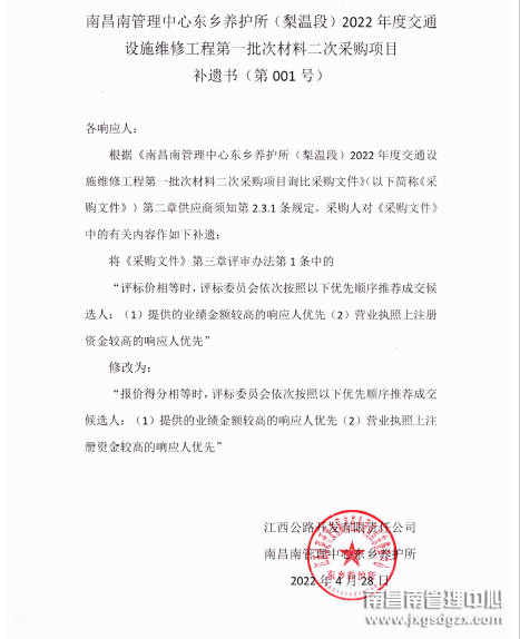 南昌南管理中心东乡养护所(梨温段)2022年度交通设施维修工程第一批次材料二次采购项目补遗书(第001号)