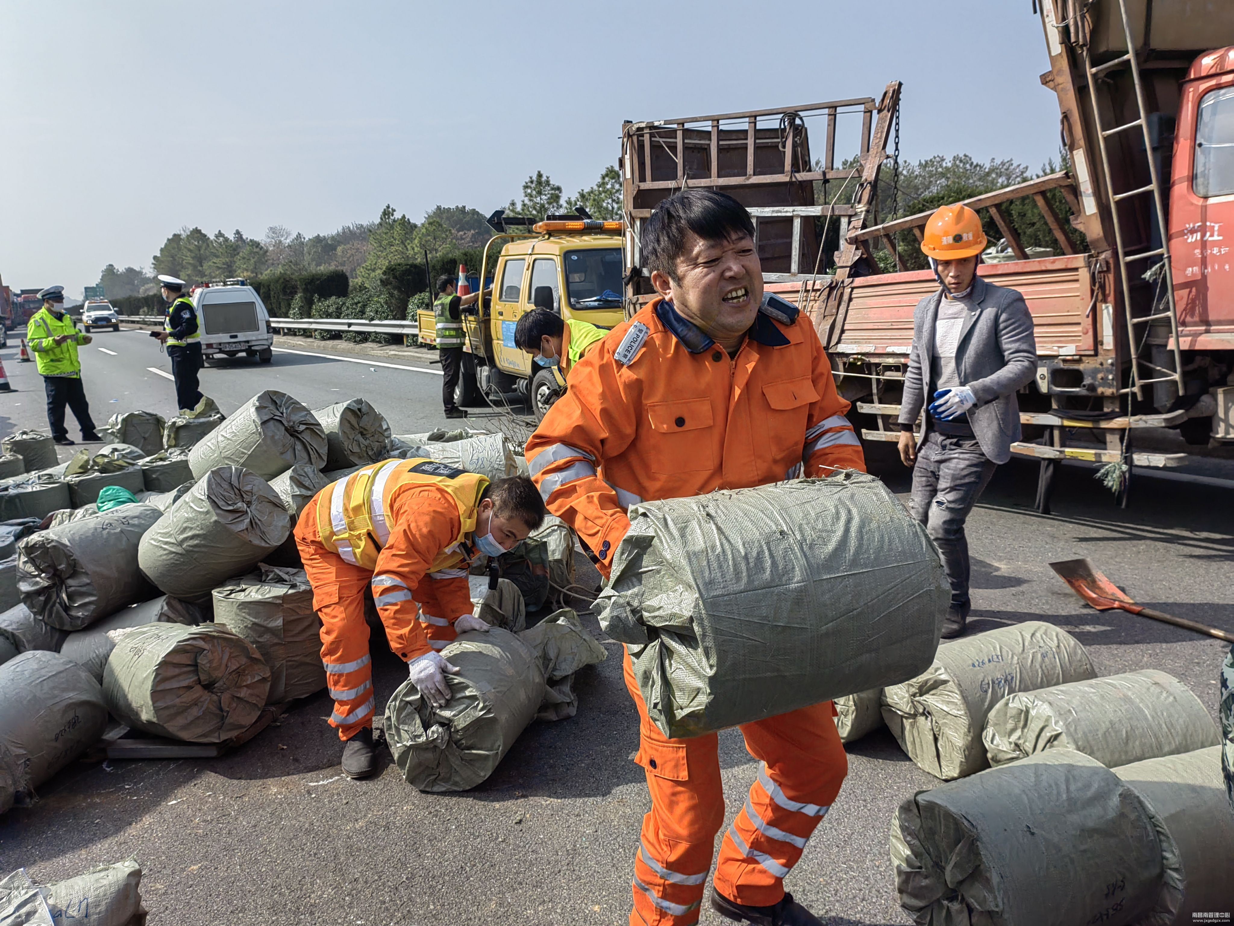 当天上午10点左右,沪昆高速梨温段上海方向K532公里处发生一起小货车爆胎侧翻事故,为了尽快恢复交通,车辆救援队杨梅岭中队救援人员纷纷动手搬运,将单个重达150斤的货物搬上转货车。经过大家的努力,10分钟后便疏导出行车道和应急车道,便于后方积压车辆缓慢通行。在大家的齐心协力下,现场散落货物全部搬运完,第一时间快速将行车道、应急车道货物转移。