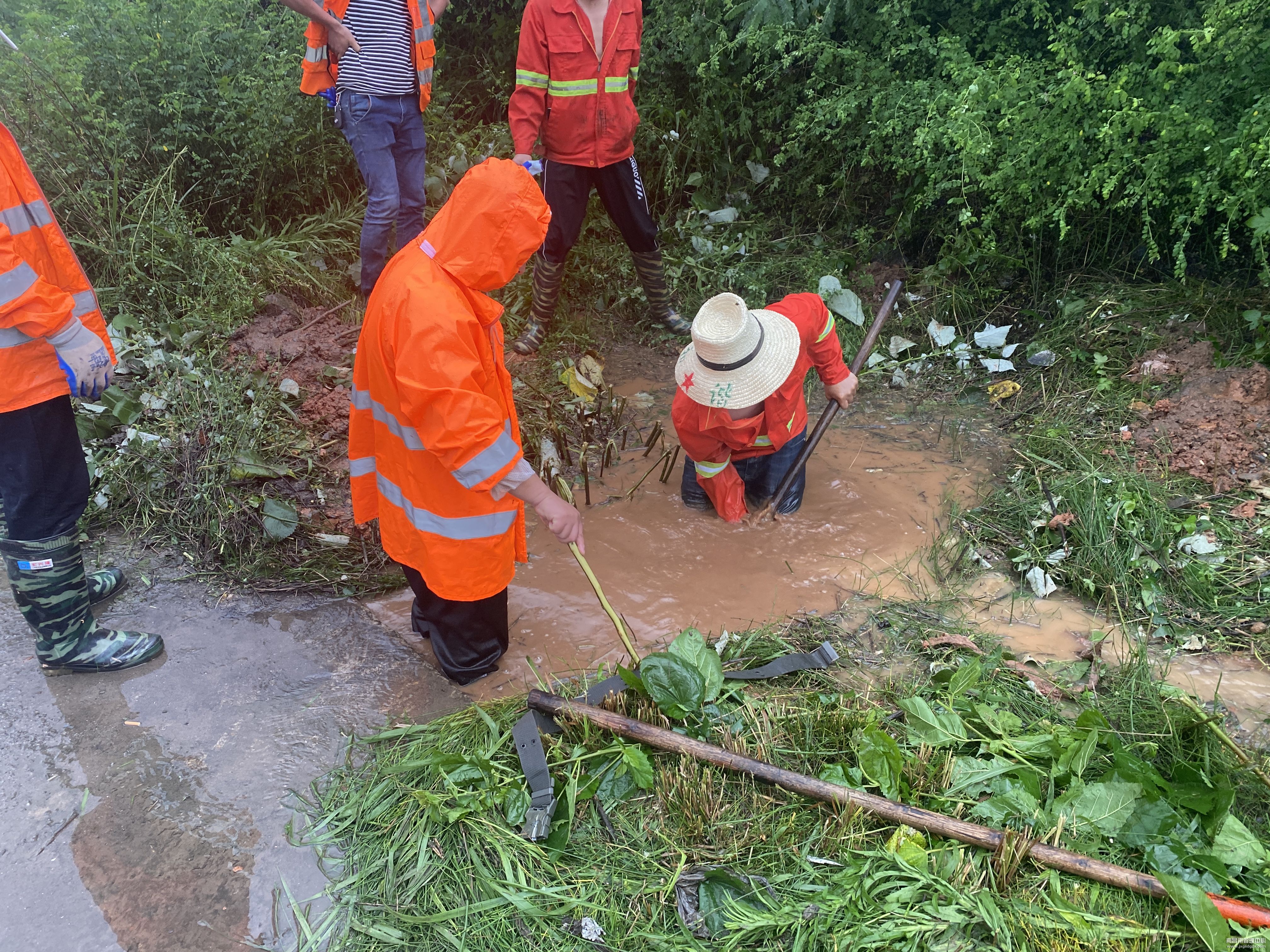 通过现场查看,因边坡排水不畅,导致雨水回流,路面积水严重影响广大司乘出行安全,该站及时根据现场情况展开清理工作。工作人员分工协作,有的开沟引流,有的清理杂草,有的用头盔舀水,挖泥抛石,有的巧用沙袋挡洪水,养护人员大半个身子都陷在了泥潭里......经过5个多小时的奋战,终于及时处理了隐患点赢得了广大人民群众的认可,增强了人民群众的获得感、幸福感、安全感,充分展现了罗湖养护人责任担当。