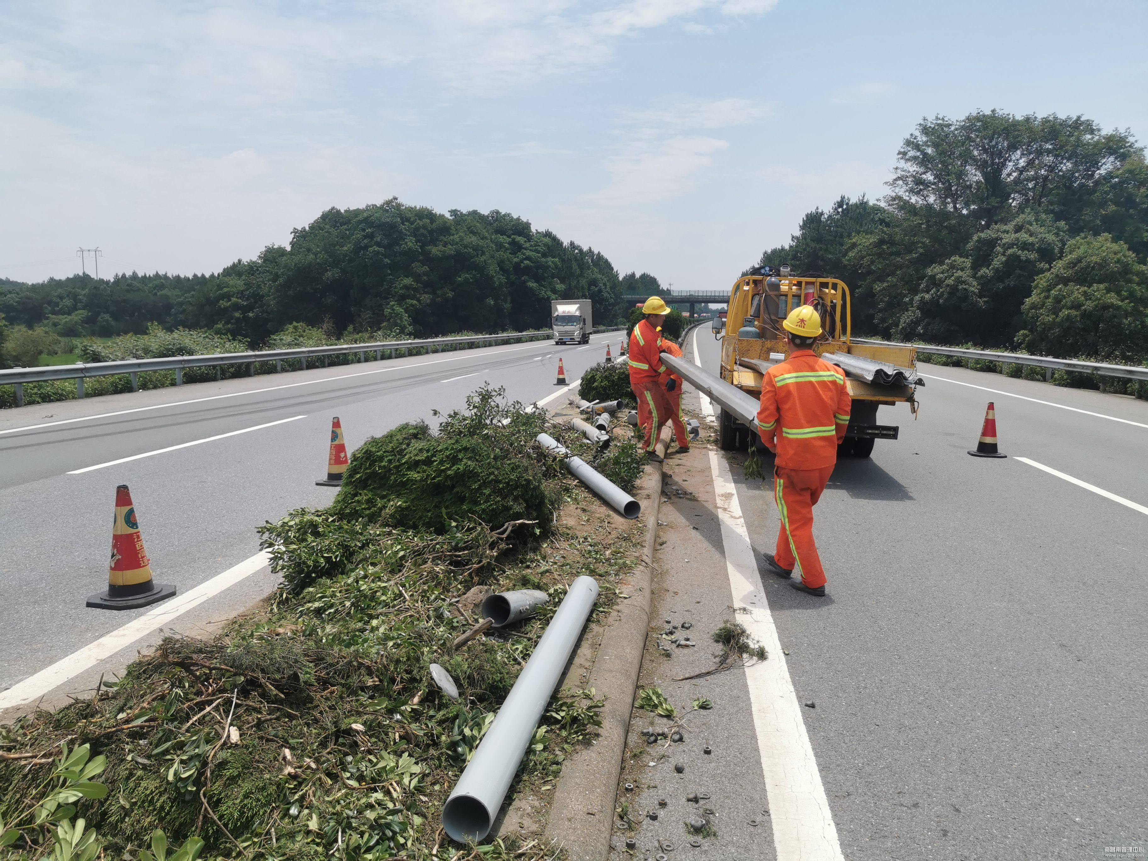 维修队人员到达现场后快速进行分工,一组负责抬护栏,一组负责拆除立柱,一组负责切割,不一会就把现场撞毁的立柱和护栏全部拆除并清理出现场。随后更换立柱和护栏板,维修队员先用打桩机准确无误的安装立柱,紧接着再安装护栏板,大家齐心协力将护栏扶起,有条不紊地安装防阻块、柱帽、螺栓固定护栏……经过一个半小时的紧张抢修,成功修复、更换了此次事故造成的交安设施损坏,及时排除了高速行车安全隐患,现场恢复了车辆正常通行,确保了广大司乘人员的安全。