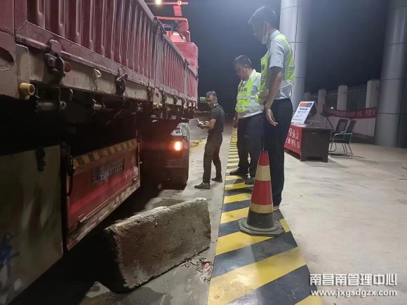 近日,南昌南管理中心进贤收费站入口一辆车牌为赣AXXXXX半挂货车因操作不当把一个车道隔离水泥墩卷入车轮底下,幸好坐道收费员发现得快,及时制止该车继续往前开。