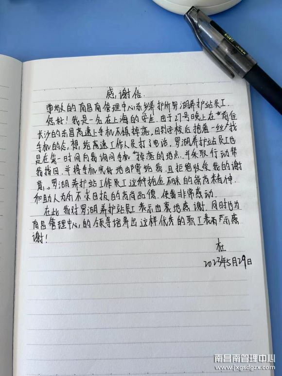 该失主对罗湖养护站的行为高度赞扬,并以最真诚的感谢方式手写感谢信至该站工作人员。(吴旻)