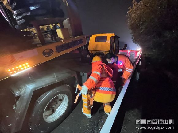 在返回的路上,南昌方向K523公桩处,又发生了一起3车追尾事故,队员们立即下车做好安全围蔽,并在预警车后方指挥积压车辆缓慢通行。经检查,有两辆小车可以正常驾驶,中间的面包车无法自行驶离,于是他们立即调度在上饶西收费站值守的拖车赶赴现场大家分工协作,5分钟后便成功将面包车上板、驶离现场,消失在黑夜尽头。
