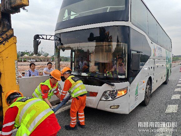 考虑现场情况,救援人员一边安抚乘客的情绪,一边加快现场施救,并商量出救援方案:利用大型拖车进行牵引下高速,并安排转运车辆将司乘人员转运至就近收费站。5分钟后,大型拖车以及转运车到达现场。